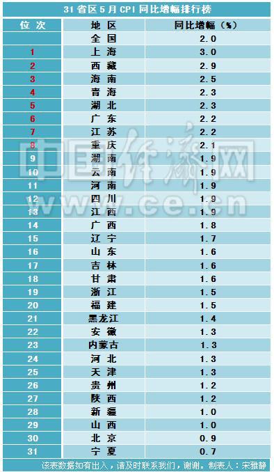 据国家统计局物价数据显示,5月全国居民消费价格总水平(CPI)同比上涨2.0%。据中国经济网记者统计获悉,仅8省区CPI同比涨幅超全国水平。在31省区CPI涨幅排行榜中,上海CPI同比上涨3.0%居于榜首,宁夏仅涨0.7%垫底。值得关注的是,仅上海一地CPI涨幅还坚守在“3时代”,超7成省区涨幅低于2%。